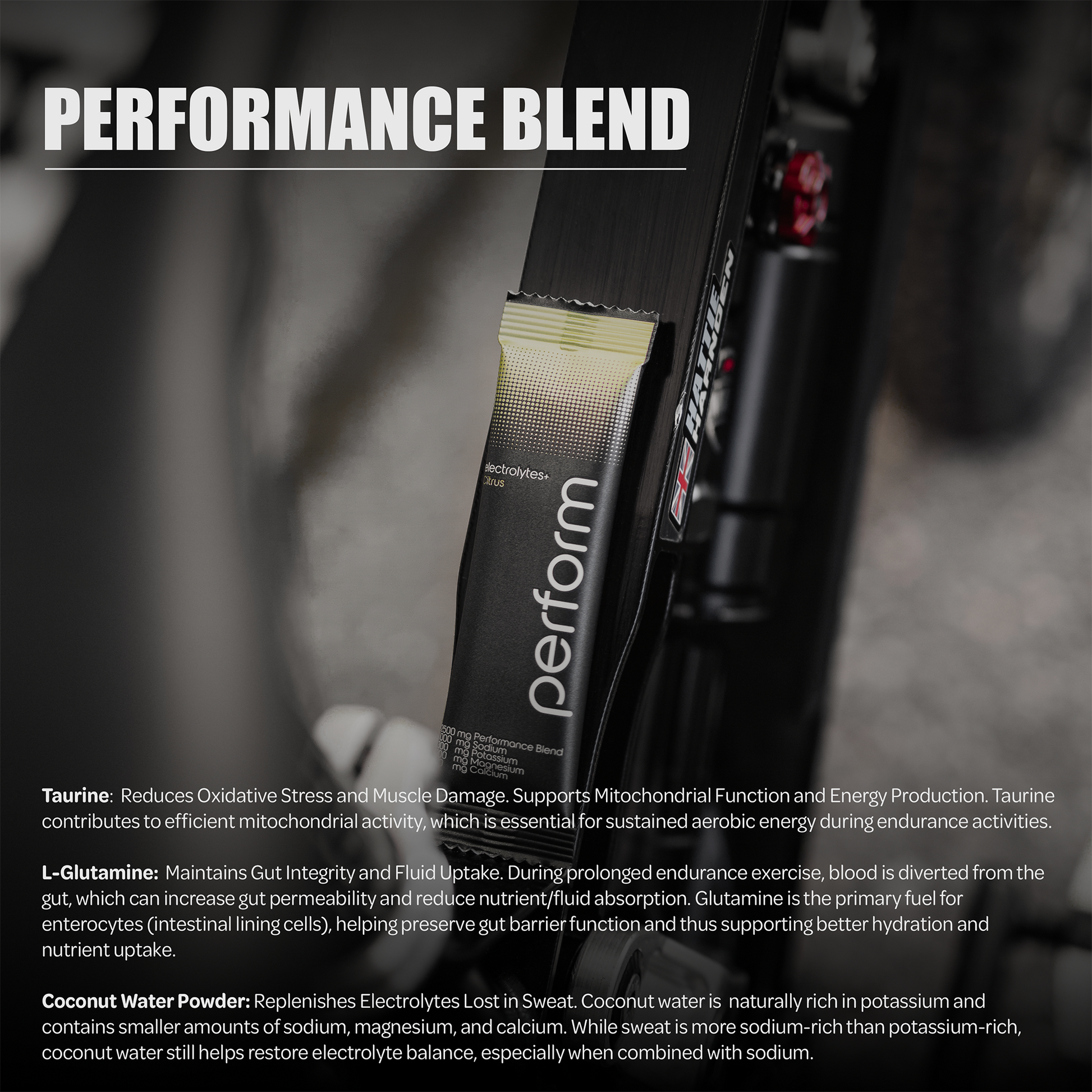 The Performance Blend is made up of Taurine, Glutamine and Coconut Water Powder. All of these ingredients have been selected as they can help with endurance performance and absorption.