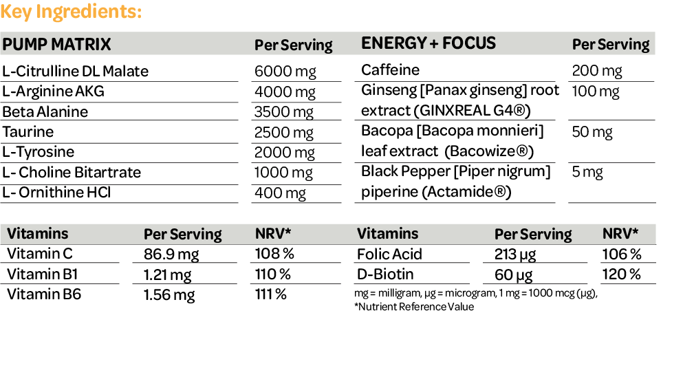 Orange Passion Flavour: L-Citrulline DL-Malate, L-Arginine alpha-ketoglutarate, Beta alanine, Taurine, L-Tyrosine, L-Choline bitartrate, Calcium silicate, Silicon dioxide, Flavouring, L-Ornithine HCl, Sucralose (Sweetener), Colouring, Caffeine anhydrous, Ascorbic Acid, Ginseng [Panax ginseng] root extract (GINXREAL G4®), Bacopa [Bacopa monnieri] leaf extract (Bacowize®), Black pepper [Piper nigrum] piperine extract (Actamide®), Pyridoxine HCl, Thiamine HCl, Pteroyl glutamic acid, D-Biotin